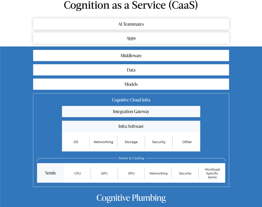 We believe that two dynamics will combine to establish AI as a powerful force. Our main form of interacting with computing devices will change to become conversational. Technology will be able to perform cognitive tasks that augment our own capabilities. The new paradigm through which AI will be delivered and consumed will be Cognition-as-a-Service (CaaS) — which follows the mega-trends of IaaS (Infrastructure-as-a-Service), PaaS (Platform-as-a-Service) and SaaS (Software-as-a-Service). We invest in AI-first companies across all six layers of the CaaS stack.